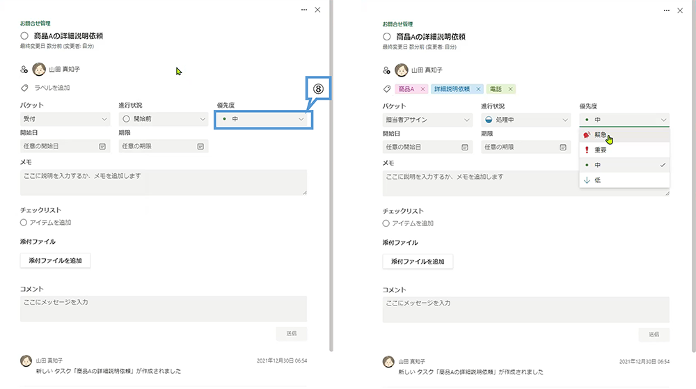 優先度(図中⑧)は、デフォルトは「中」ですが、「緊急」「重要」「低」を選択することができます。
